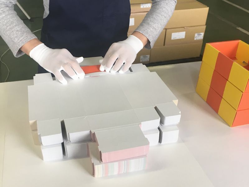 多種多様な商品箱を全て手作業で平面から組み立て、必要があれば商品をセットすることもできます。ご指定の納品箱(袋)に入れて納品します。